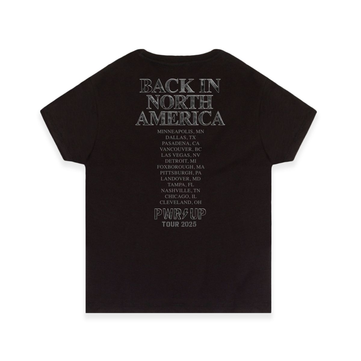 Gear up with this exclusive Back in Black PWR UP Tour Women's T-Shirt from the US 2025 Tour collection, featuring tour destinations on the back.